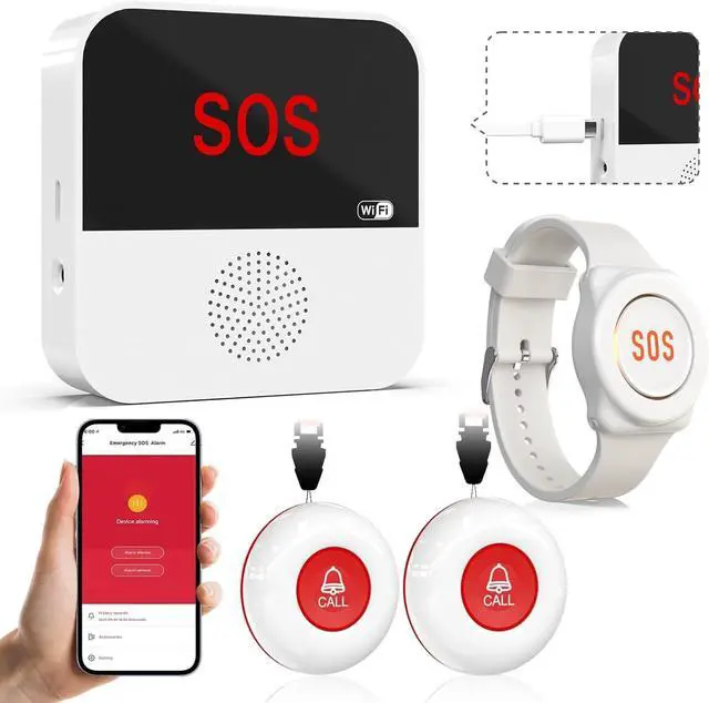 SanJie WiFi Rechargable Caregiver Pager Emergency Alert System with 2 Call Buttons, 1 Alert Watch & 1 Receiver for Seniors, Elderly, Patients, Disabled at Home - Supports 2.4GHz Wi-Fi Only