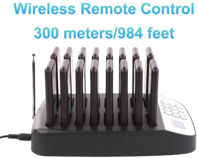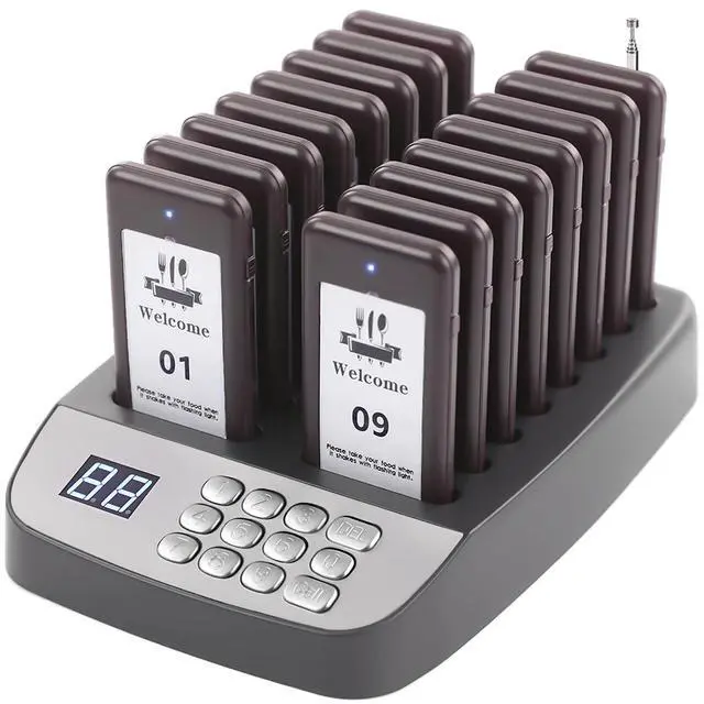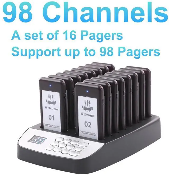 ^^ Durable Construction: Built with waterproof transmitters and receivers, the system can withstand the demanding environment of a restaurant or other fast-paced service business without risk of damage from spills or weather. ^^ Rechargeable Battery - Each receiver features a built-in 3.7V /200mAh rechargeable battery with a stacked charging design, eliminating the need for frequent battery changes. With a full charge, the receiver can work frequently for at least 20 hours. ^^ One-Touch Group Shutdown Instantly power off all pagers on the charging base by entering 99 + press CALL. Pagers must be pre-paired with the transmitter ^^