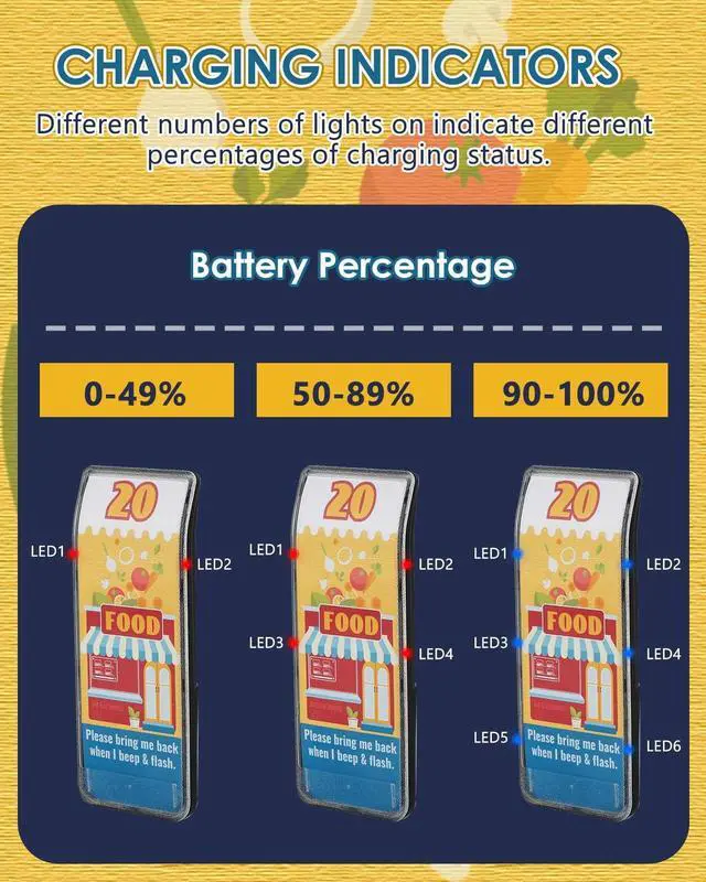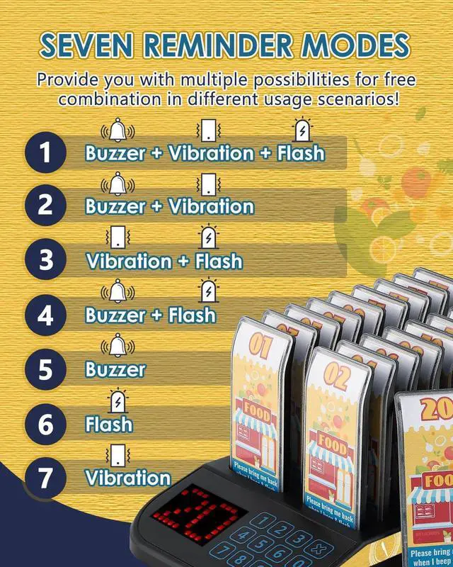 This ensures reliable communication across various layouts and environments. ^^ Seven Customizable Alert Modes Choose from seven customizable alert modes: 1) Buzzer + Vibration, 2) Buzzer + Flash, 3) Vibration + Flash, 4) Buzzer + Vibration + Flash, 5) Buzzer Only, 6) Vibration Only, and 7) Flash Only. These combinations provide versatile options tailored to different usage scenarios, ensuring optimal performance and user satisfaction. ^^ Newly Upgraded Charging Indicators Our pagers come with intuitive charging indicators that display different numbers and colors based on the battery charge percentage. This allows you to easily select fully charged pagers when distributing them to customers, while also reminding you to recharge them in a timely manner, ensuring uninterrupted service. ^^ Sensitive Touch Screen & Splash-Resistant Keyboard Unlike traditional button-based pager systems, Crispaire adopts a touch-screen interface for more convenient and responsive operation. The splash-resistant keyboard adds an extra layer of durability, making it perfect for use in food service environments where spills and splashes are common.