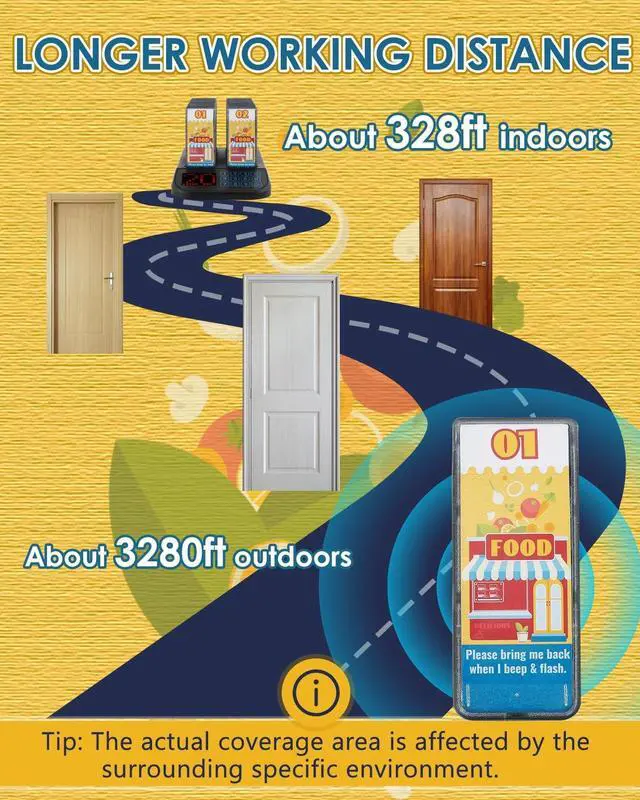 Waterproof Design With a unique sealing design, our pagers are encased in a durable outer layer that is resistant to wear and fading, making them exceptionally easy to clean. Even if completely submerged in water, these pagers will continue to function perfectly, making them ideal for restaurants, food trucks, coffee shops, and other food service settings. ^^ Extended Transmission Range Crispaire pagers offer an impressive indoor range of up to 328 feet and an outdoor range of up to 3280 feet. Please note that the actual transmission distance may vary slightly depending on wall materials.