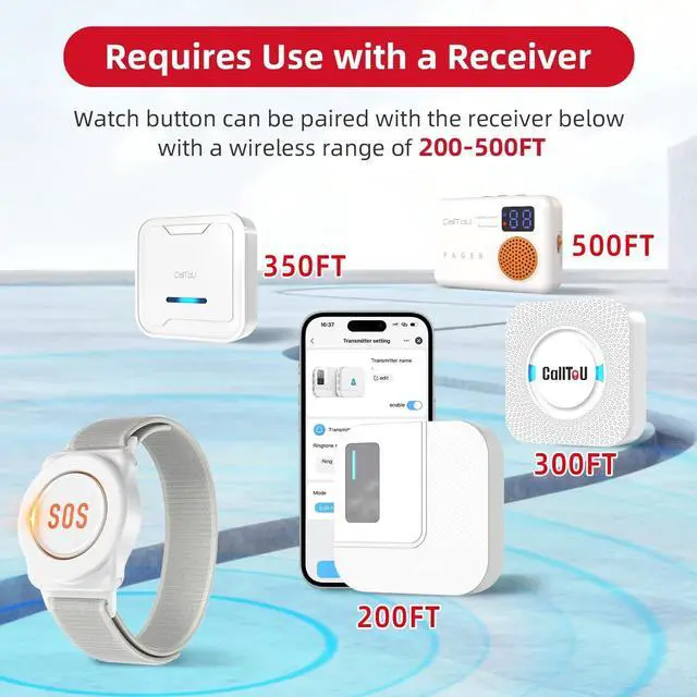 FIND YOUR PERFECT RANGE: Pair the E-06W watch with our different receivers for precise coverage: 262 ft (TY01), 300 ft (CC01), 350 ft (CC05), or a long-range 500 ft (CC28). Customize your reliable alert system.