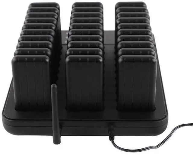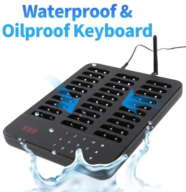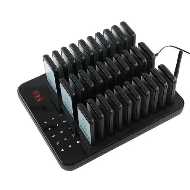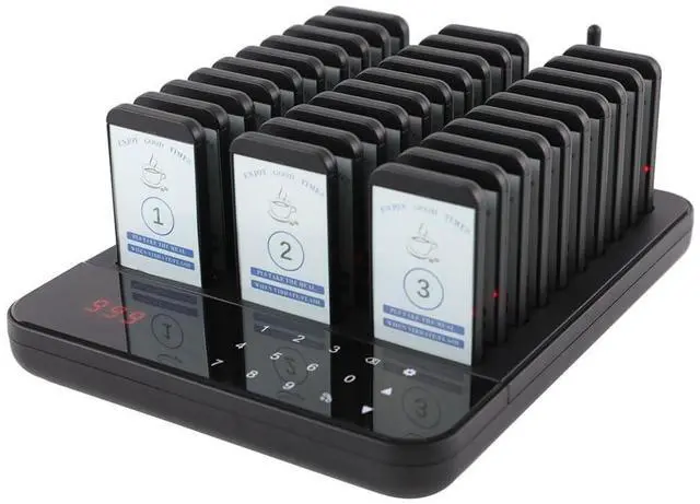 OUTSTANDING PERFORMANCE- The restaurant pagers system consists of one 998 channel wireless touch keypad transmitter and 30pcs pagers. Customers don't have to wait in line, keep social distance, and improve work efficiency. Keyboard can beep and shake when pressed. ^^ 7 PROMPT MODES- Shake+flash+buzz, shake+flash, flash+buzz, shake+buzz, shake only, buzz only and flash only. Widely used in restaurants, hotels, hospitals, churches and cafes. ^^ DIGITAL CONTROL & DISPLAY- Equiped with a large LCD screen display for easy operation and precise control. With a logo display area in front, you can place your store image, name, or other advertisements.