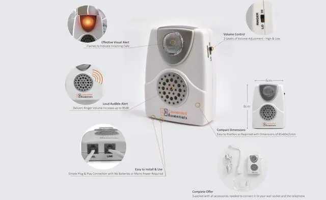 User Friendly The CEA-40 simply plugs in to your standard telephone socket and your telephone to produce a loud ring (volume can be adjusted between hi - lo) and a flashing alert no mains power is required. Simple to install and use The CEA-40 is a simple plug and play solution. With our easy to follow instructions its set up is quick and straight forward. Compact yet Capable The CEA40s compact dimensions (approx. 85x60x25mm) mean you can easily position it as you require, and is capable of increasing your telephone ringer up to 95dB.