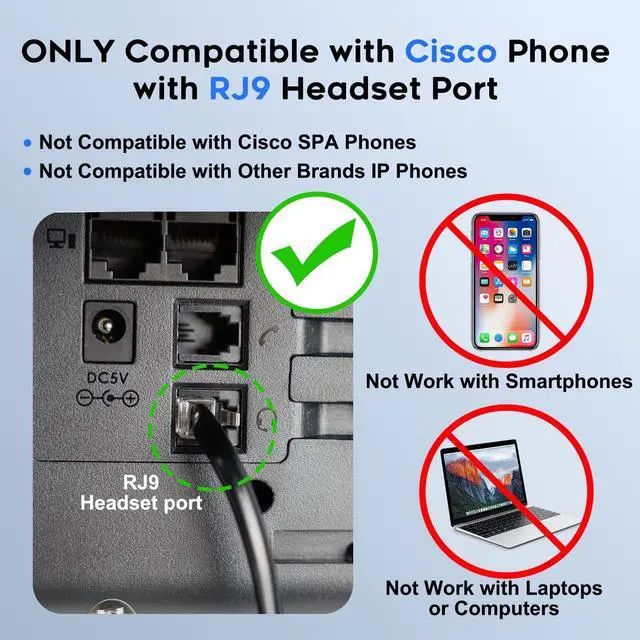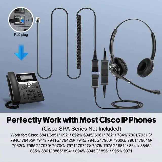 RJ9 Cisco Headset: This corded RJ9 office phone headset with microphone works with Cisco 6921, 6941, 6945, 6961, 7821, 7841, 7861, 7931G, 7940, 7940G, 7941, 7941G, 7942G, 7945, 7945G, 7960, 7960G, 7961, 7961G, 7962G, 7965G, 7970, 7970G, 7971G, 7975G, 7985G, 8811, 8841, 8845, 8851, 8861, 8865 and 8900, 8941, 8945, 8961, 9951, 9971. ^^ Phone Headset with
