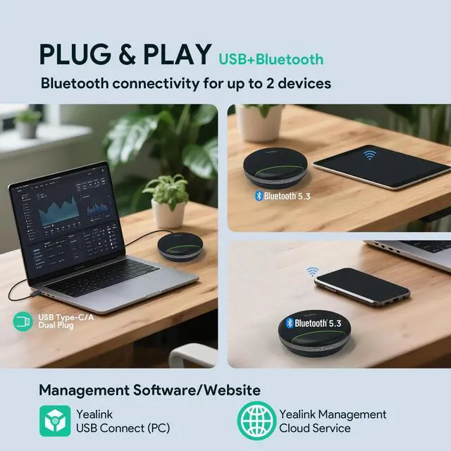 Supports dual device connection: Bluetooth 5.3 (with wireless range up to 30m) and a 1.2 m USB-C wired connection, including a USB-C/A adapter for plug-and-play compatibility. ^^ Compact Conference Room