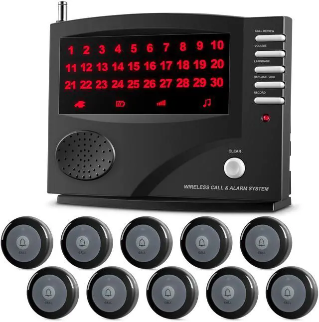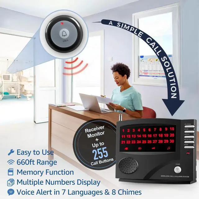PORTABLE PAGING SYSTEM: The portable monitoring unit is applicable in various settings such as nurses station, emergency, clinics, hospital elderly and senior care nursing homes restaurants and cafe. The convertible bottom stand enables the central monitoring unit to sit stable on flat surface or mount it on wall. ^^ MULTIPLE LANGUAGES WITH NUMBER CALL OUT: The wireless call and paging system has programmed 7 languages and 8 different alert tones in 3 volume levels, select a language or a tone that suits your environment.