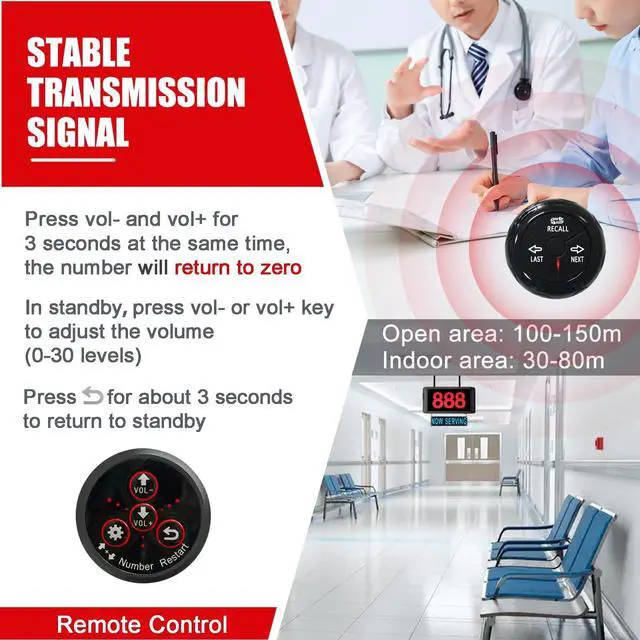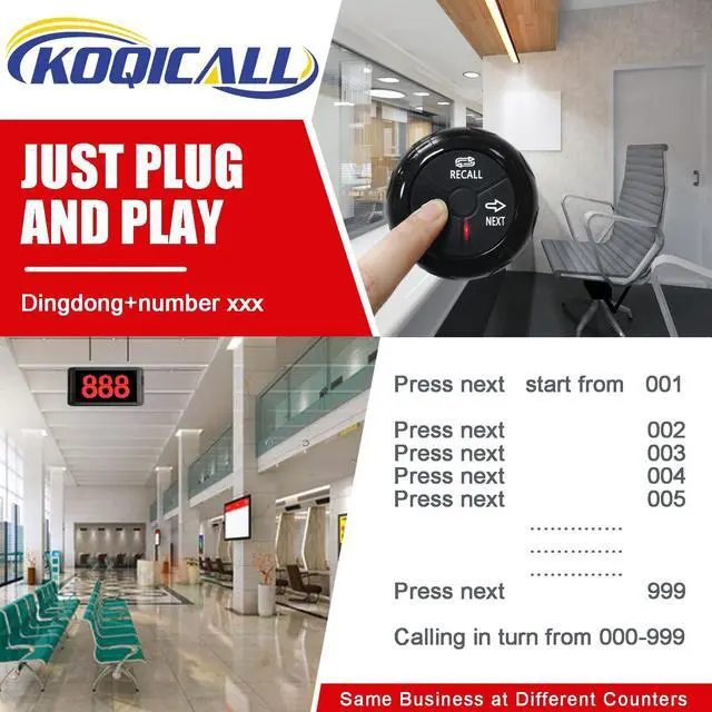 A: You only need to give the customer a queue number (take a number from ticket dispenser), when it is the turn, press the NEXT key on the calling button, the screen receiver will display and broadcast, then the customer will go to the service place.