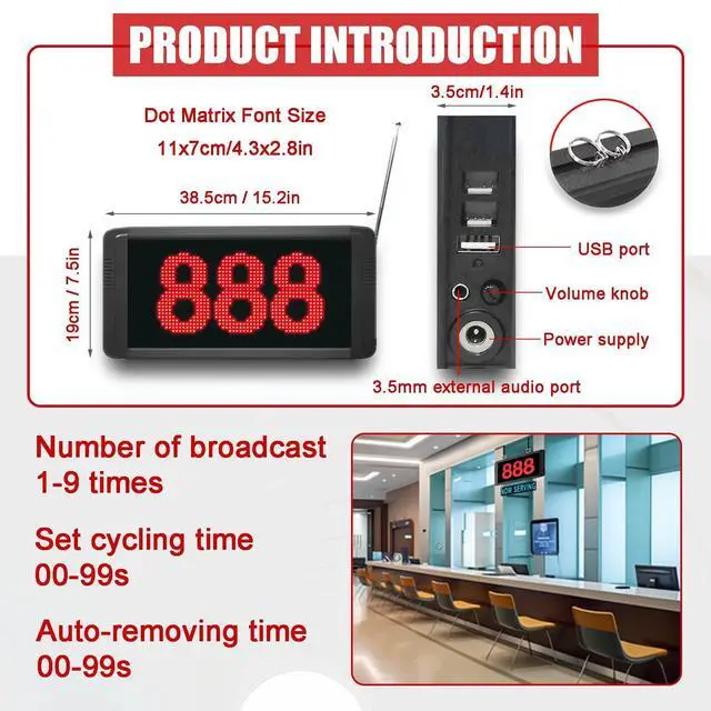 Screen Specification: 1. With high strength ABS+Metal cover2. Wall mounted or place on the table3. Dot matrix display, show one group number 4.3 -digits from 001-999 or NO. 001-NO. 9995.