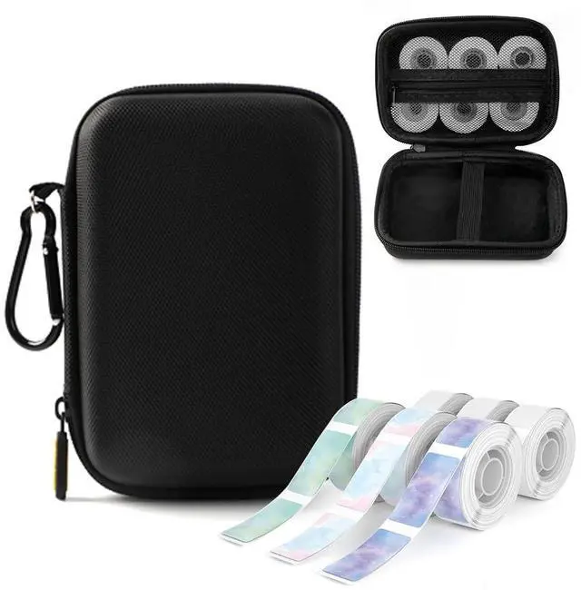 1x Black D30 Label Maker Machine with 1x Black Case and 4 Rolls of White Label Tape, 1 Rolls of Clear Label Tapes, 2 Rolls of Stary Pattern Label Tapes