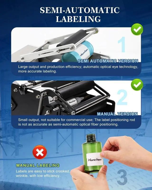 SEMI-AUTOMATIC LABELING: Why choose us? 1) Its output and production efficiency are much larger than a manual labeling machine or traditional manual labeling, more suitable for small enterprises and companies. 2) The Label sensor adopts automatic optical eye technology, more accurate labeling, reducing label waste and packaging loss.