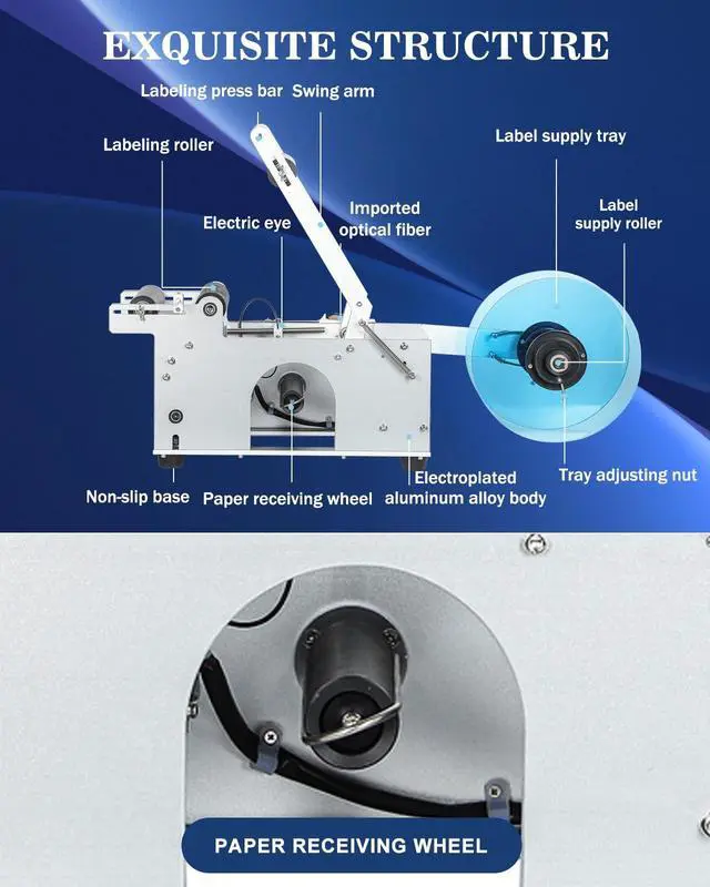 ^^ EXQUISITE STRUCTURE: There is paper receiving wheel inside the machine for collecting waste materials, which is easy to clean, automatic bottom paper receiving, saving time and effort; This semi-automatic labeling machine is small and does not take up too much space, which can be placed on the table or on the assembly line and is easy to operate.