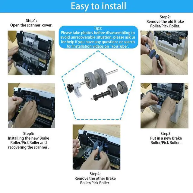 (Tips): please check the suitability of your model before purchase ^^ Quick solution If your scanner is experiencing paper jams, poor paper output, serious wear and tear of brake pick rolle and insufficient friction etc, there may be a problem with the brake roller, and you can try a new kit to get your scanner back to work quickly. ^^ Hassle-free shoppingCustomer satisfaction is our unremitting pursuit, regardless of any reason you are not satisfied with our products, you can request a return or exchange at any time, we will 7/24 for your service!