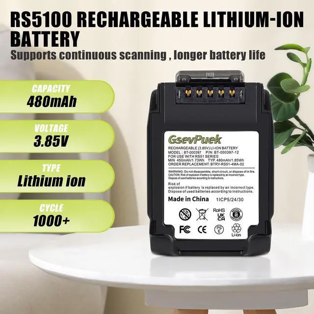 Compatible With: RS51 RS5100 RSBT5 RS61 RS6100 RS61B0 RS61C0 RS51B0 RS51C0 Ring scanner. BT-000398 BT-000397 BTRY-RS51-7MA-01 BTRY-RS51-4MA-01. ^^ Reliable quality and safe to useFor Zebra RS51 Battery, built-in microchip, battery built-in overcharge, overdischarge, overvoltage, overcurrent and overheat protection to ensure your product is safer to use. ^^ Installation and ChargingBT-000397 replacement battery is easy to install and fits perfectly, lithium-ion battery technology provides extended runtime with no memory effect. ^^ After-sales service12 months warranty guarantee, if you are not sure this battery is what you need, you can send us the picture, we will reply to you, let customer satisfaction is our purpose.