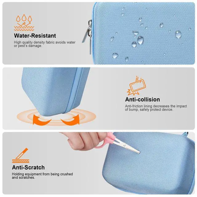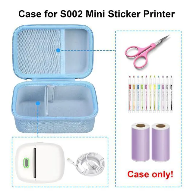 (Note: for sale is case only, S002 study label printer and other accessories are not included) ^^ Exquisite DesignThis S002 sticker printer case features sturdy double zips which can be opened closed freely and smoothly in multiple directions. The S002 thermal printer case comes in a deep spacious mesh pocket so you can have more space to accommodate self-adhesive thermal paper and small printer accessories, keeps them tidy and clean in the S002 sticker maker carrying case and easy reach. Adjustable Velcro strap in S002 thermal sticker printer case that you can flexibly place the printer. ^^ Superior MaterialThis S002 label maker protective case is made of high- density fabric and hard EVA material which is anti-squeeze, anti-collision, splash-proof, dust-proof, anti-stain and semi-waterproof, protect S002 sticker maker from damages caused by indoor or outdoor activities, which can prevent bumps and scratches, and extend the life of your cute S002 study printer. Soft velvet interior lining keeps S002 pocket mobile sticker printer safe in the hard S002 sticker maker case. ^^ Travel-FriendlyThis S002 sticker maker blue case comes in a soft wristband and climbing carabiner, kids may have multiple ways to carry ORGSTA S002 mini sticker printer case to go anywhere, or hang the label maker storage case up when not use.