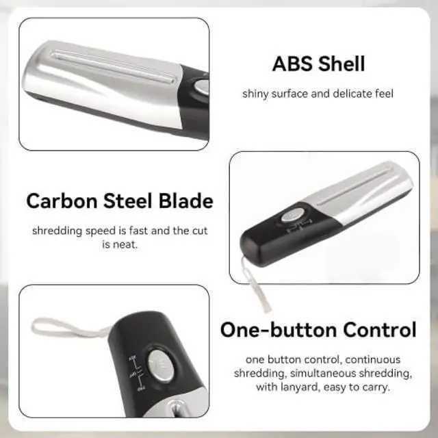 Easy to Use --- Shredding 4mm, one key control, continuous shredding, simultaneous shredding, easy to carry. ^^ Material --- The is made of ABS shell with a bright and a delicate feel. The use of carbon steel knife mouth hard and sharp, shredding speed, neatly cut. ^^ Small and Portable --- Compact design, small size, space-saving, easy to place, economical and practical, the best choice for office and home use. ^^ Applicability --- Suitable for use in a variety of scenarios, suitable for offices, graphic stores, law firms, etc.
