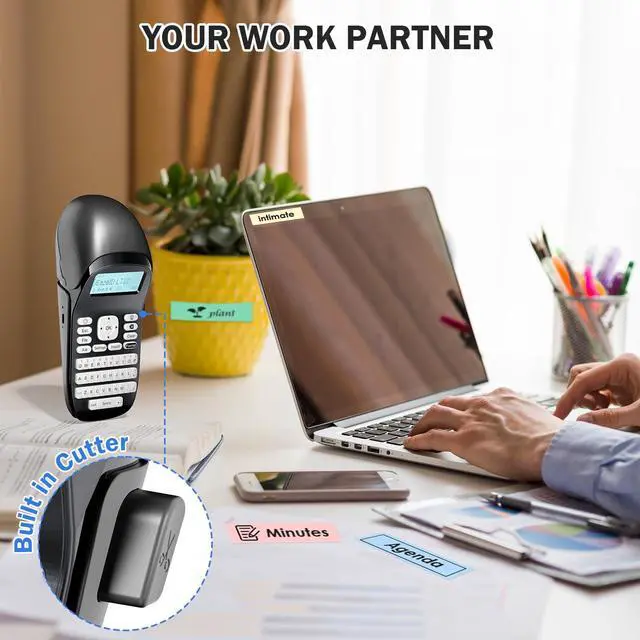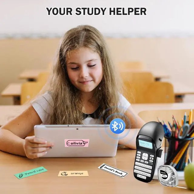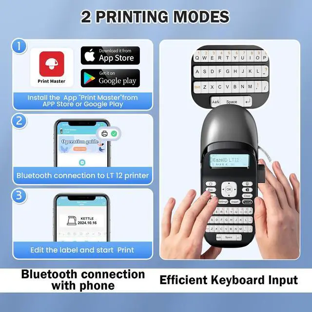 ^^: Built-in 1200mAh lithium battery. With a full charge time of only 2.5 hours, it provides long-lasting battery life and can print up to 48m of label tapes, and is compatible with power banks. This inkless label maker does not require any batteries ^^: Seamlessly connect to our Print Master app for a more powerful visual editing experience. With support for 1600 icon symbols, 163 fonts, and 287 border styles for creative label editing through your phone ^^: The LT12 Label Maker supports a wide range of tape types. Additionally, it accommodates various materials such as Satin Ribbon Label Tapes for gifts and crafts, Iron-on Name Labels for clothing, and Luminous Labels for visibility in the dark. With compatibility with Dymo 100H, your labeling options are limitless. ^^ 1 LT12 handheld labeler, 1 PZ label maker tape, 1 Type-C cable, 1 user manual and 1 Quick Start Guide