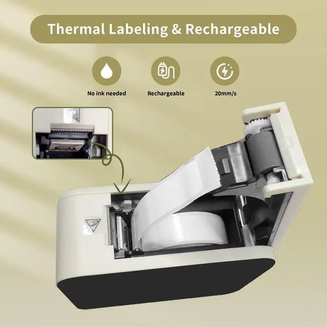 Easy TO UseP15 Bluetooth label printer supports iOS & Android. Mini Bluetooth wireless thermal label printer, connect to your smart phone in 2 seconds via Bluetooth 4.0. The free App is downloaded from APP STORE or Google Play. ^^ Inkless Fast PrintingThe label machine uses thermal printing technology, low noise, no ink or cartridge needed, lower operation cost than the normal printers. Bluetooth label printer which only supports black and white printing instead of color printing. Built in 1200mAh rechargeable battery, which keep printing for 4 hours, and standby at least 1 week, not need to buy batteries.