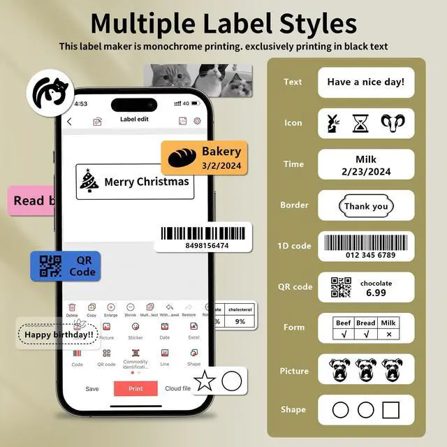 • Multifunctional APPWireless label printer also supports bar-code, qr code, picture, scan code, text, Excel import, smart OCR scanner, massive vivid icons, easily create your own customized labels, preview and save record, improving efficiency.It can be Large-capacity continuous printing.