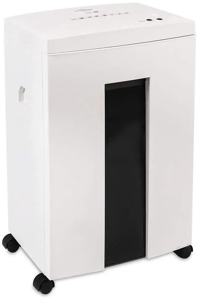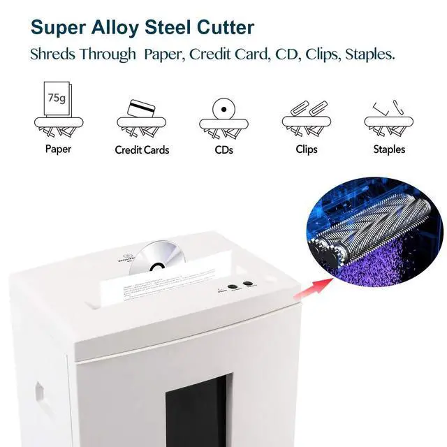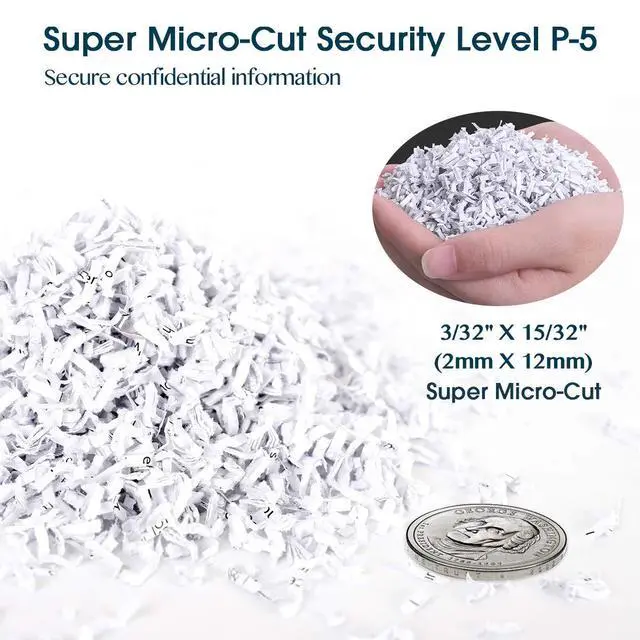 SUPER MICRO CUT HIGH SECURITY LEVEL p5 paper shredder to secure confidential information. The paper slot blade shreds max 10-sheet paper or a credit card into particles measuring 3/32" x 15/32" (2mm x 12mm); The CD slot blade cut one CD or a credit card into 3 strip pieces ^^ CONTINUOUS RUNNING TIME UP TO 60 MINUTES shredder for home office which is supported by patented cooling system ^^ LOW NOISE LEVEL 54dB ultra quiet heavy duty shredder has 6 gallons pull-out waste bin with large transparent window ^^ SUPER ALLOY STEEL CUTTER shreds through staples, paper, clips, credit cards and junk mails at ease ^^ ETL Certified product and Manufacture's 1-Year limited warranty protects your interests.