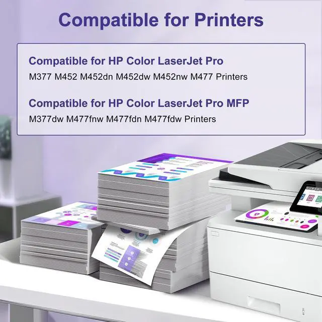 Compatible Printer Models: The 410A Toner Cartridges 4 Pack High Yield compatible for HP Color LaserJet Pro M377, M452, M452dn, M452dw, M452nw, M477; Color LaserJet Pro MFP M377dw, M477fnw, M477fdn, M477fdw printers.