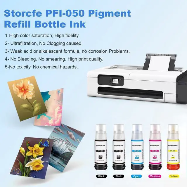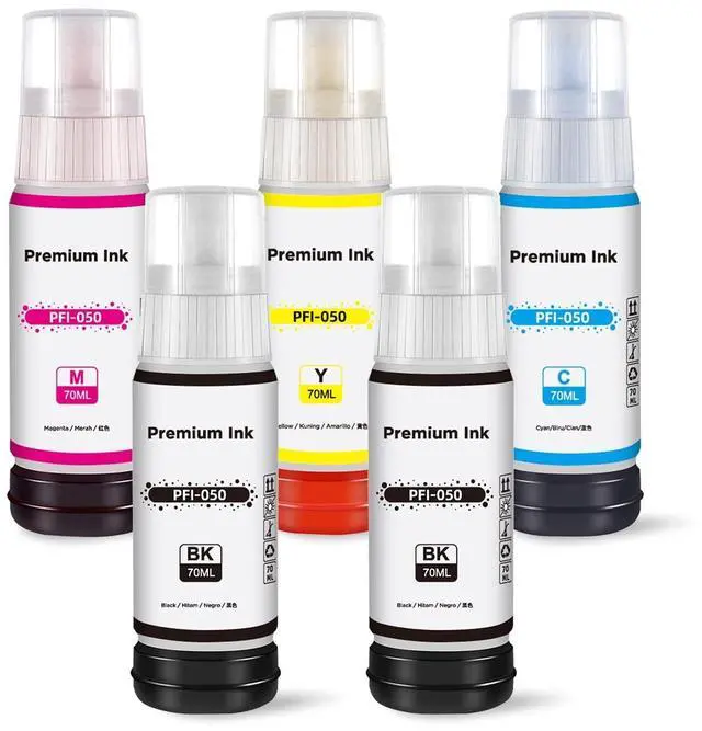 • Package include (Non-Original) 5x Replacement for Canon PFI050 PFI-050 Pigment ink bottles (1*Black, 1*Cyan, 1* Magenta, 1* Yellow )