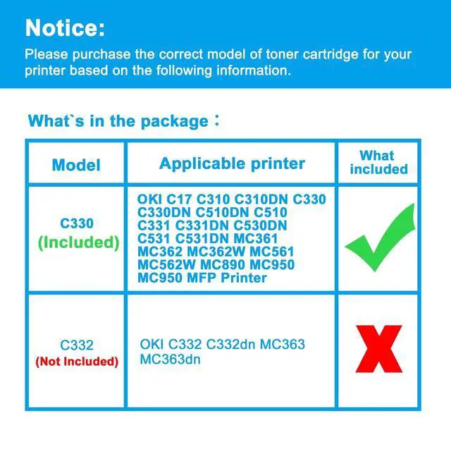• Compatible Printers: Replacement for OKI C17 C310 C310DN C330 C330DN C510DN C510 C331 C331DN C530DN C531 C531DN MC361 MC362 MC362W MC561 MC562W MC890 MC950 MC950 MFP