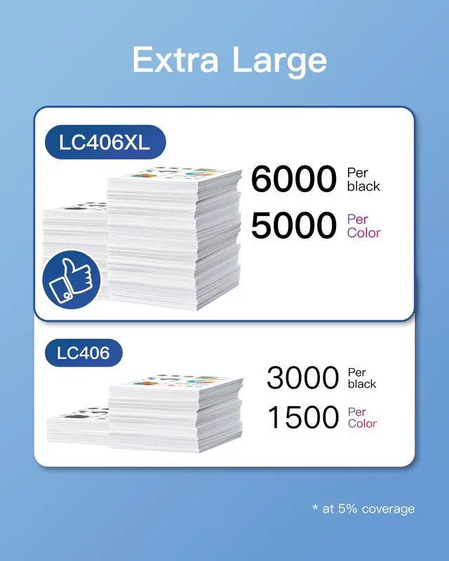 1. Extra Large CapacityUP to 6, 000 pages per LC406XL LC 406XL Black Ink Cartridge (LC406XLBK) and 5, 000 Pages for LC406XL LC 406 XL Color Ink Cartridge LC406XLC LC406XLM LC406XLY (Letter/A4, at 5% coverage) ^^ 2. UPGRADED CHIPSGPC Image Compatible LC406XL LC406 XL Ink Cartridges with Latest Upgraded Chips for Brother LC406 ink Cartridges replacement LC406XLBK LC406XLC LC406XLM LC406XLY to make sure compatibility with your printer. ^^ 3. Compatible PrintersOur compatible Brother LC406XL LC406 XL Ink Cartridges and LC406 Ink Cartridges for Brother Printer also compatible with Brother MFC-J4335DW, MFC-J4335DW XL, MFC-J4345DW, MFC-J4345DW XL, MFC-J4535DW, MFC-J4535DW XL, MFC-J5855DW, MFC-J6555DW, MFC-J6955DW, MFC-J5955DW, HL-JF1 Printer ^^ 4.