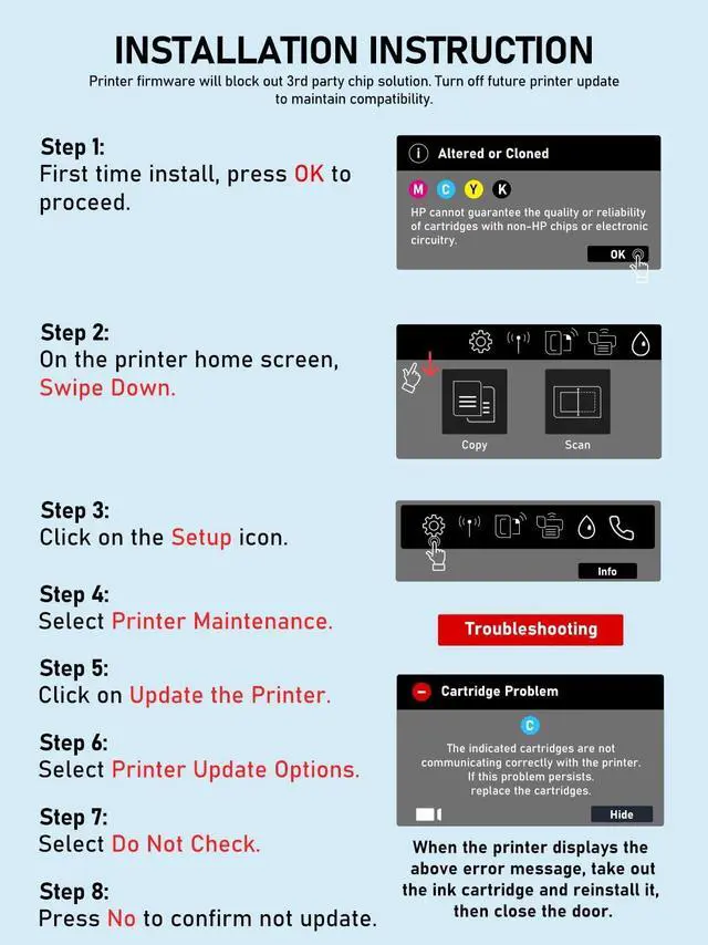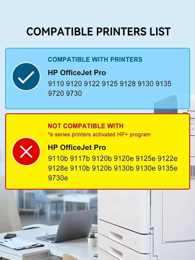 NOT Compatible Printers: *e series printers with HP+ (HP instant ink) services, (HP OfficeJet Pro 8120e 8122e 8124e 8125e 8130e 8132e 8134e 8135e 8138e 8139e) ^^