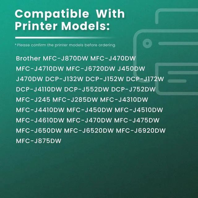 Compatible with: Brother DCP-J132W DCP-J152W DCP-J172W DCP-J4110DW DCP-J552DW DCP-J752DW MFC-J245 MFC-J285DW MFC-J4310DW MFC-J4410DW MFC-J450DW MFC-J4510DW MFC-J4610DW MFC-J470DW MFC-J4710DW MFC-J475DW MFC-J650DW MFC-J6520DW MFC-J6720DW MFC-J6920DW MFC-J870DW MFC-J875DW inkjet printer ^^