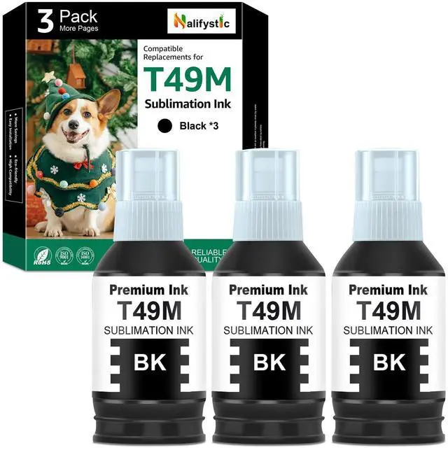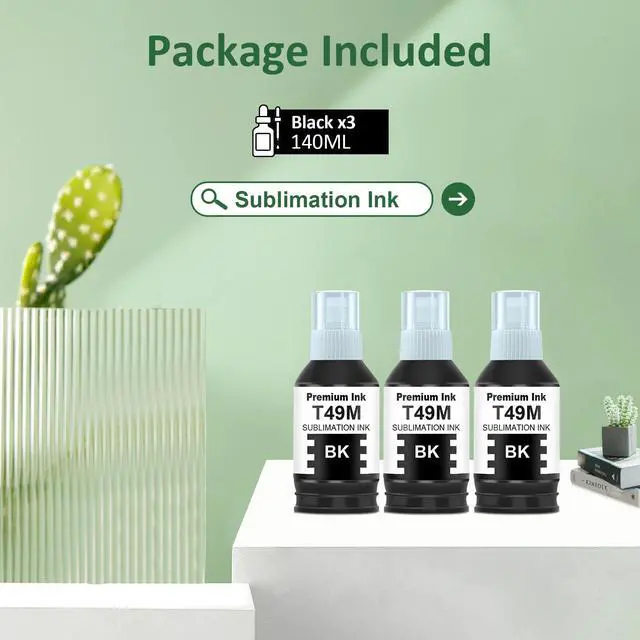 Compatible T49M Ink Bottles Includes3 x t49m1 black ink bottle. ^^ Compatible for Printer ModelCompatible T49M1 Ink Refill Bottles Blsck Replacement for Compatible for F170 F570 Sublimation Printers. ^^ Compatible T49M Approx. Page YieldThese compatible t49m1 ink bottle replacements for t49m1 each have up to 8, 000 pages balck and offer superior print performance and quality. ^^ Superior CompatibilityEach compatible t49m1 ink bottle undergoes quality and functional tests before leaving the factory, ensuring the printing quality of the ink bottle. Whether you print documents, presentations or charts, you will get reliable printing effect, just as if it won't damage the printer.