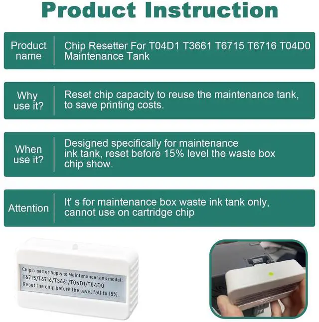 Maintenance tank chip resetterNote: This chip resetter works for Maintenance box / Maintenance tank / Waste ink tank Only! It CAN NOT work on Ink cartridges! The chip resetter works for the Printer