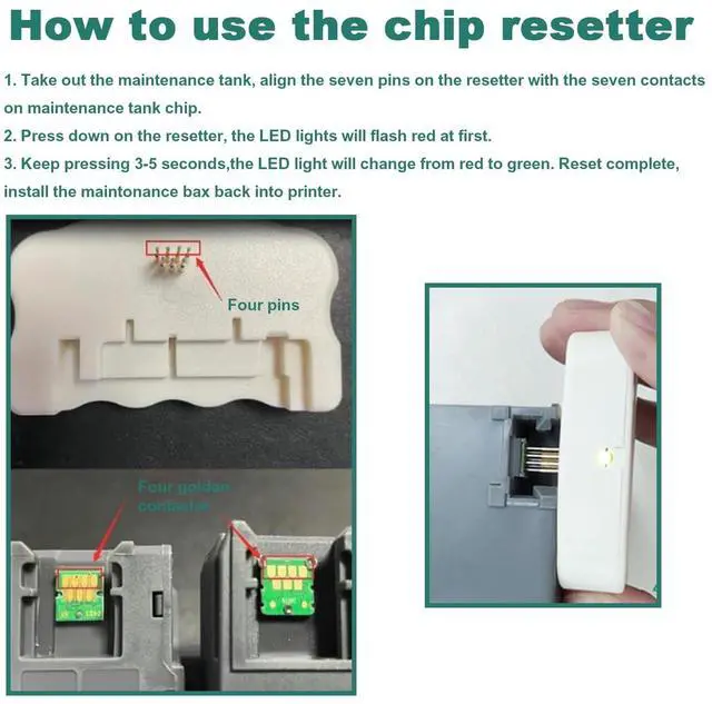 Resetter for printer: Expression Premium ET-7700 ET-7750Please find the step-by-step guide below on how to use the resetter: 1. Take out the maintenance tank from your printer. 2. Align the seven pins on the resetter with the seven contacts on the maintenance tank chip. 3. Press down on the resetter firmly. Initially, the LED lights will flash red. 4. Keep pressing for 3-5 seconds. The LED light will change from red to green, indicating that the reset is complete. 5. Once the reset is done, reinstall the maintenance tank back into your printer.