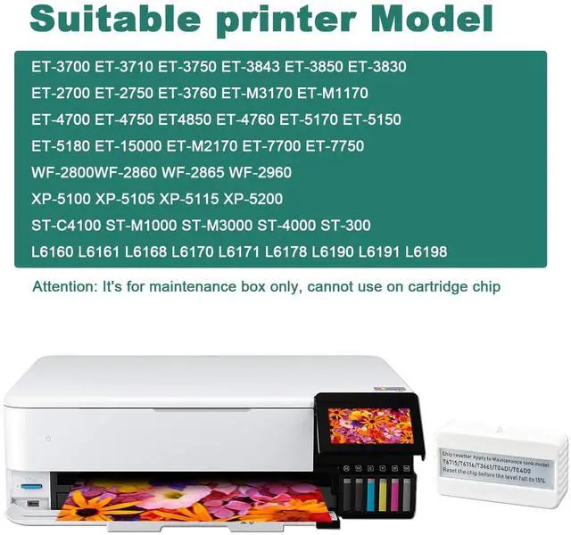 Resetter for printer: Expression Home XP-5100 XP-5200EcoTank ET-M1140 / ET-M1170 / ET-M1180 / ET-M2140 / ET-M2170 / ET-M3140 / ET-M3170 / ET-M3180EcoTank ET-2760 / ET-3700 / ET-3710 / ET-3750 / ET-3750 Unlimited / ET-3760 / ET-3830 / ET-3843 / ET-3850 / ET-4750 / ET-4760 / ET-4850 / ET-15000EcoTank ET-M1170 / ET-M1180 / ET-M2170 / ET-M3170 / ET-M3180EcoTank L6168 / L6178 / L6190 / L6198EcoTank Pro ET-5150 / ET-5170 / ET-5180WorkForce ST-M1000 / ST-M3000 / ST-3000 / ST-4000 / ST-C4100 / WF-2860 /WF-2860DWF / WF-2861 / WF-2865DWF WF-29602) T3661/T366100 Maintenance Box chip