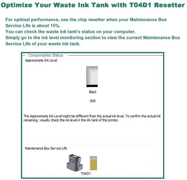 Maintenance tank list: 1) TT04D1/ T04D100/ C13T04D100 Maintenance Box chip