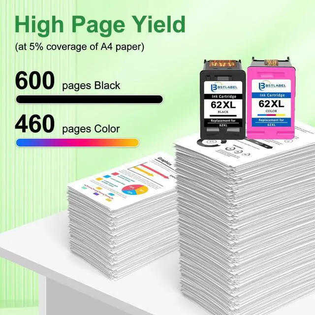 Multi-Page Yield: This Replacement for HP Envy 7640 Ink Which Page Yield Is Up to 600 pages per 62XL black cartridge (A4 paper size).