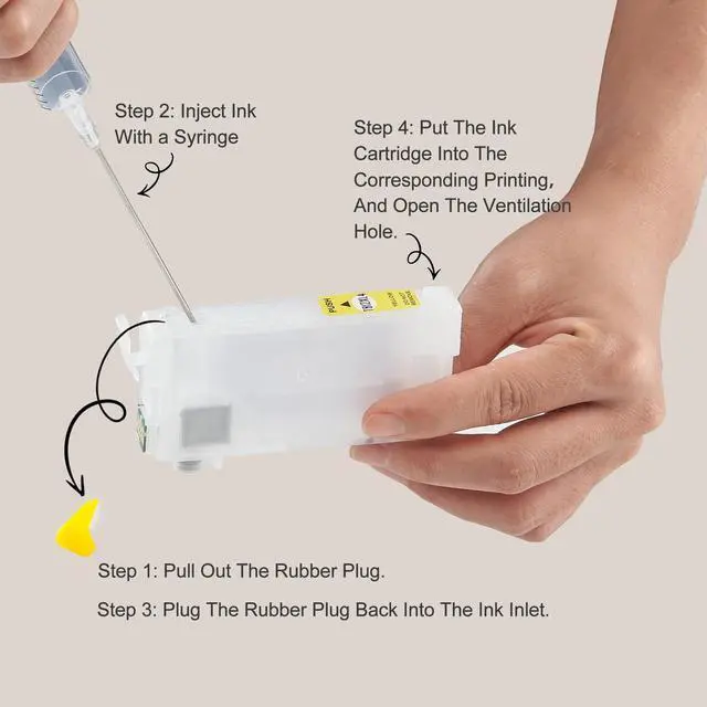 ^^ Suggestion: Empty ink cartridges can only contain 90% ink, so as to prevent the ink from overflowing and polluting the printer during use. And be sure to unplug the rubber plug of the ventilation hole during use. If your printer is brand new and you have not used the original ink cartridge, please first install the original ink cartridge and initialize the printer so that your new printer can recognize and use our ink cartridge. If you have any questions about this product, please feel free to contact us.