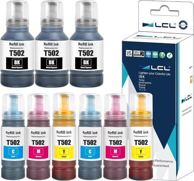 Includes 9 Ink Bottles: Up to 7500 pages per T502 black ink bottle in 127ml; 6000 pages per T502 Cyan/Magenta/Yellow ink bottle in 70ml (with 5% Coverage of A4 paper).