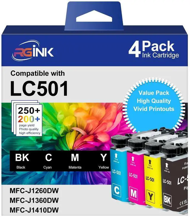 Package Contents: 4 Pack lc501 series inks for brother mfc-j1360dw ink cartridges--1 Black, 1 Cyan, 1 Magenta, 1 Yellow (High-Value.