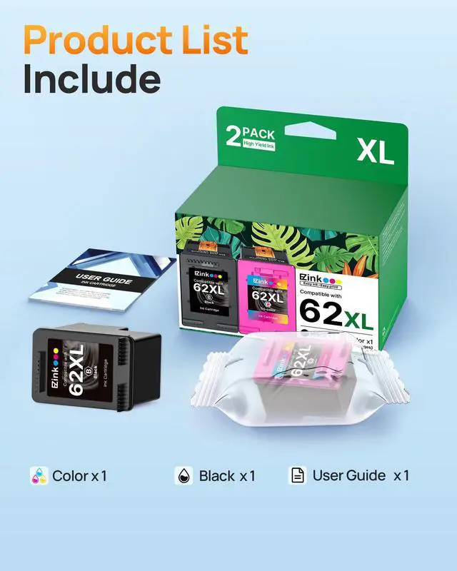 Product name: E-Z Ink high yield 62xl ink cartridges remanufactured for hp ink 62xl black and color combo pack Replacement for hp 62xl ink cartridge combo pack ^^