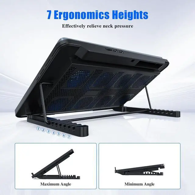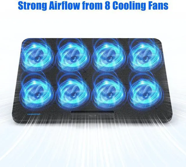 8 Ultra Quiet Fan & Adjust Fan Wind SpeedLIANGSTAR New upgrade laptop cooler with 8 ultra quiet fans. The cooling fans are equipped with blue light, the brightness of the light reflects the speed of the fan, and the speed is infinitely adjustable with a gear button. ^^ 7 Height Adjustable & Phone Holder Design The cooling pad have 7 height for you select to adjust suit different laptop. Unique phone holder stored on the left side of the laptop cooler base, can conveniently put your phone beside cooling pad left or right to view information easily.