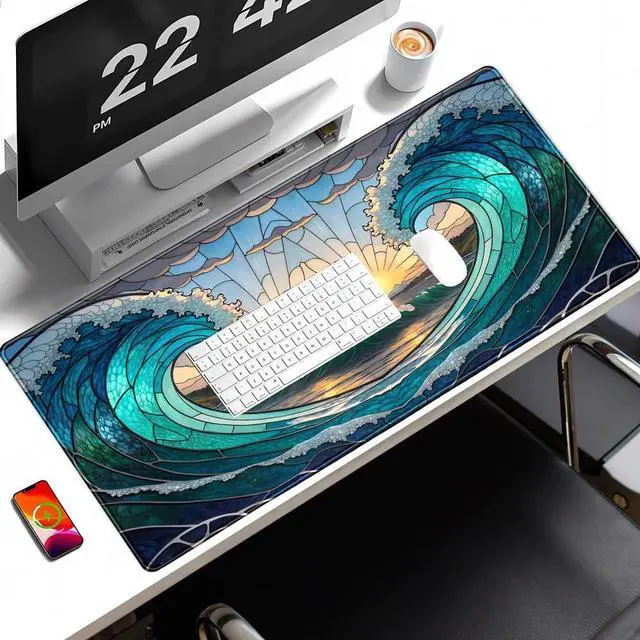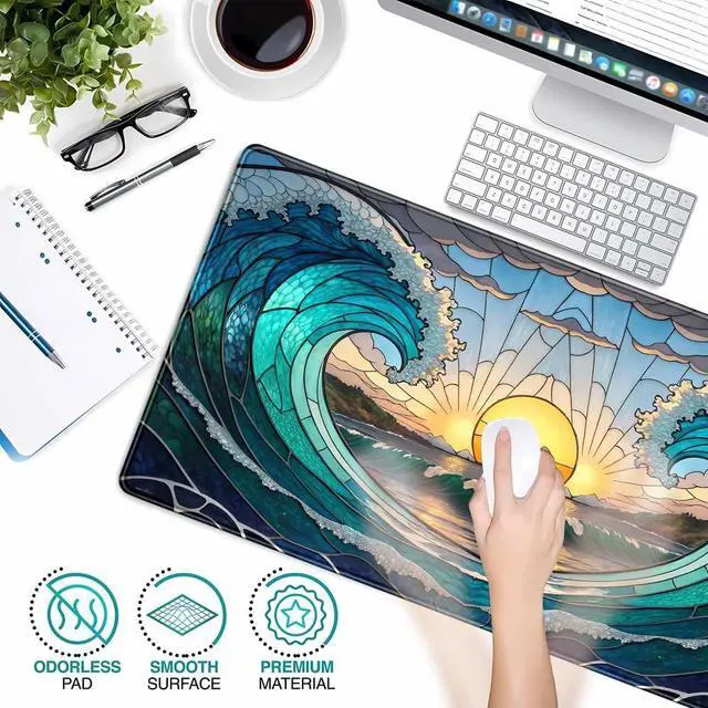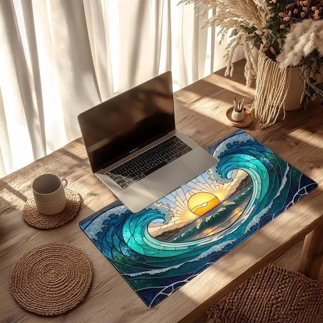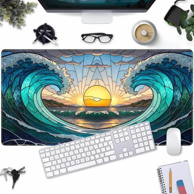 Beach Sunset Desk Mat Cute Large Mouse Keyboard Desk Pad, Aesthetic Cute Gaming Desk Keyboard Mats for Desk Pad Mat, Faux Stained Glass Sunset Mousepad Southwest Landscape Desk Pad 31.5x15.7 in
