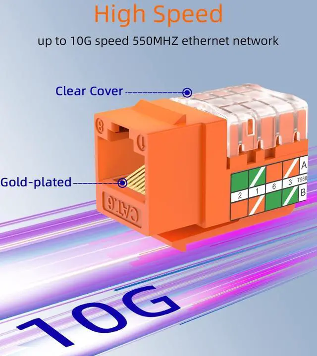 ^^ 10G Applications: Rj45 keystone are golden plated and designed for high-speed data transmission up to 10G speed 550MHZ ethernet network. Rj45 ethernet jack is compatiable with the latest TIA- 568.2 -D standard.