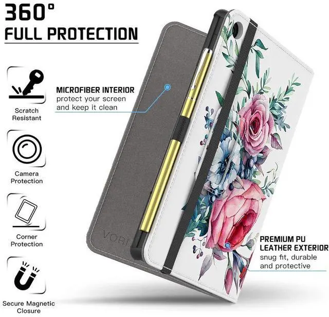 Wake/Sleep]: Automatically wakes or puts fire 7 2019 case to sleep when the lid is opened and closed to maximize battery life. Easy access to all features and controls ^^ [Multi-functional]: Built in leather hand strap for comfortable one-handed use. Full-cover case with magnetic closure and elastic closure strap keeps the cover securely shut. And added elastic pencil holder (stylus NOT included) ^^ [Lightweight and protective]: Made from durable PU (synthetic) leather with soft microfibers to protect your screen from dust and scratches. The case is easy to install and remove ^^ [Lifetime service]: We also value quality as much as you do. We offer free replacement if you are not fully satisfied with our cover for fire 7 2019, VORI adhere to the high-quality products and services for the purpose