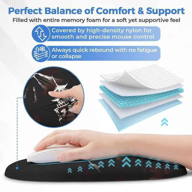 [ERGONOMIC WRIST PAIN RELIEF] Say goodbye to wrist strain! The mouse pad is geometrically designed to perfectly cradle your wrist, promoting a neutral hand position. This significantly reduces pressure on the carpal tunnel and surrounding muscles, providing effective relief during long hours of work or gaming, unlike traditional flat mouse pads. ^^ [PREMIUM MEMORY FOAM & COMFORT] Experience cloud-like support! Filled with 100% high-density memory foam and covered by a smooth, skin-friendly fabric, this wrist rest offers superior comfort. It gently conforms to your wrist for personalized cushioning, making every click and movement a pleasure.