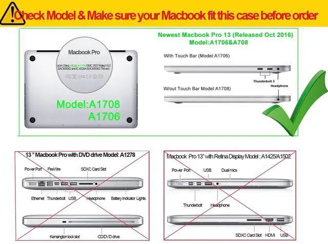 Model: A1706 A1708 A1989, Not for any other models!!! Please check your Macbook model which printed on the bottom ^^ Slim and light, macbook case, snap on design, NO logo cut out, light shine through the case ^^ Premium matte finish, access to all ports, no need to remove the case ^^ Easy for heat disbursement, free to put on &take off, Soft and smooth touch feeling ^^