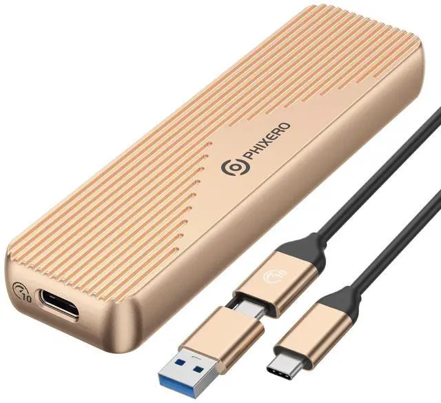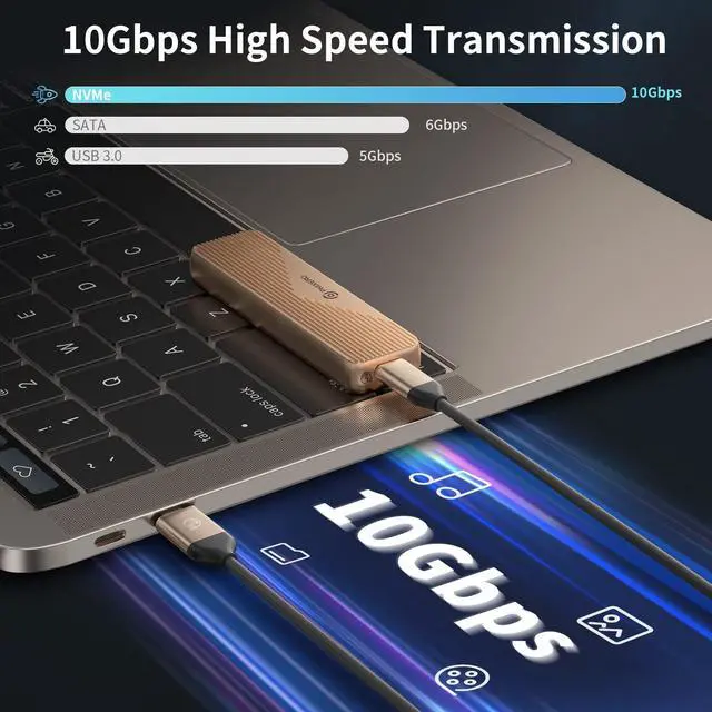Windows/Mac os/luxin/Android system (Note: this M. 2 ssd enclosure is not suitable for double-sided SSD) ^^ 10Gbps High Speed Transmission Enjoy HD movies in 10 seconds. M. 2 SSD enclosure adopts the NVME protocol and is equipped with a USB 3.1 gen 2 interface, with rate of up to 1000Mbps/s, 2X that of USB 3.0. Transfer videos, pictures and large files without waiting, saving you time ^^ 2 In 1 USB C Cable 10Gbps high speed USB 3.1 Gen2 2-in-1 cable, with a coaxial winding design that effectively shields external disturbance signals, guaranteed integrity of file transfers, and has better transmission effect when used with nvme external enclosure