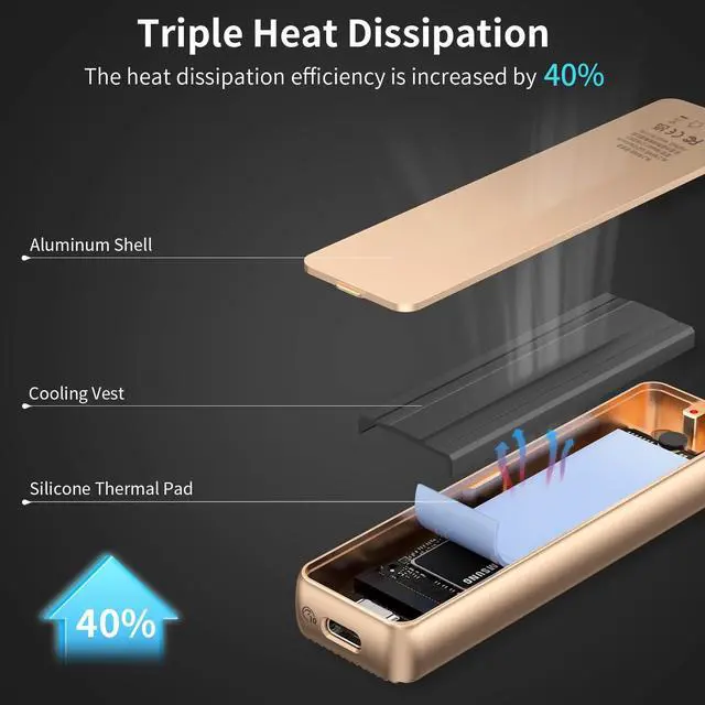 Triple Heat Dissipation Heat dissipation efficiency of NVME enclosure is increased by 40%. The sandwich structure composed of 'aluminum shellcooling vestsilicone thermal pad' closely contacts M. 2 SSD, and quickly transfers the heat generated by SSD to the aluminum shell. The groove design on the surface of the M. 2 NVMe SSD enclosure effectively increases the heat dissipation area ^^ Stable transmissionKeep the working temperature of M. 2 SSD stable within 60, without the trouble of slow down, and ensure continuous transmission. Through the excellent heat dissipation performance of M.