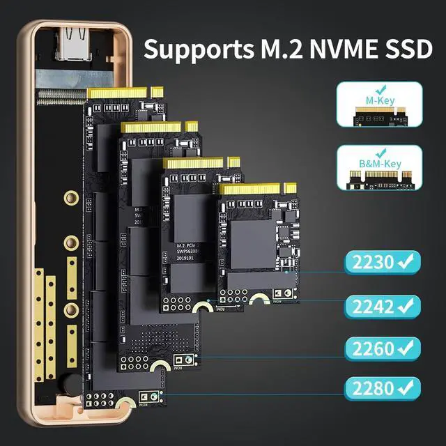 2 Enclosure, the impact of temperature rise on the transfer rate of NVME SSD enclosure is reduced, so that your M. 2 SSD can work in a stable temperature environment ^^ Wide CompatibleM. 2 enclosure fully compatible with 2230/2242/2260/2280 size and M. 2 SSD M key/B+M key interface, suitable for