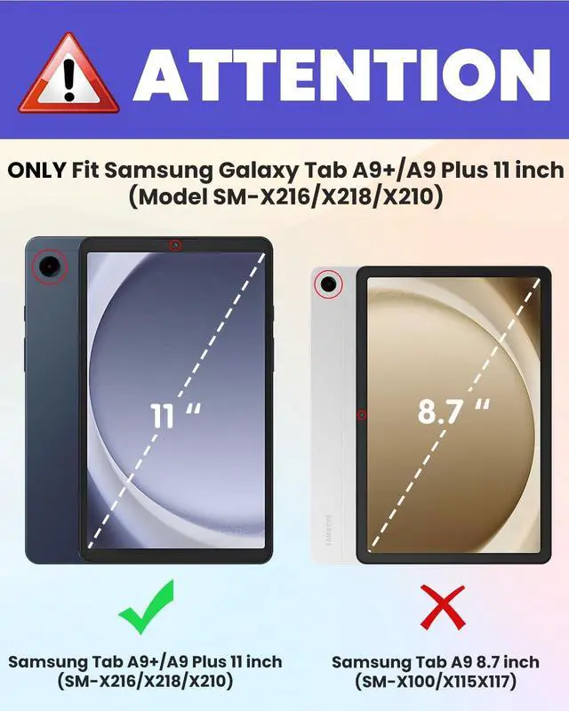 • Compatibility: This tablet case is only compatible with Samsung Galaxy Tab A9 Plus 11 inch 2023 (model: SM-X210/X216/X218). Note: It does not fit other models