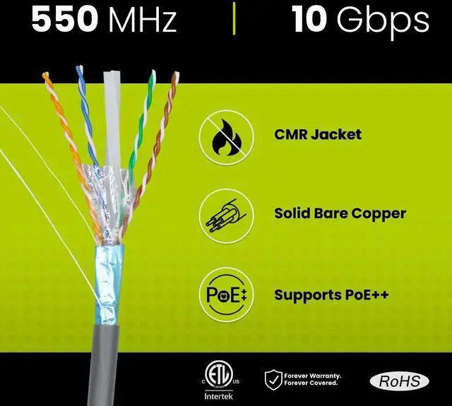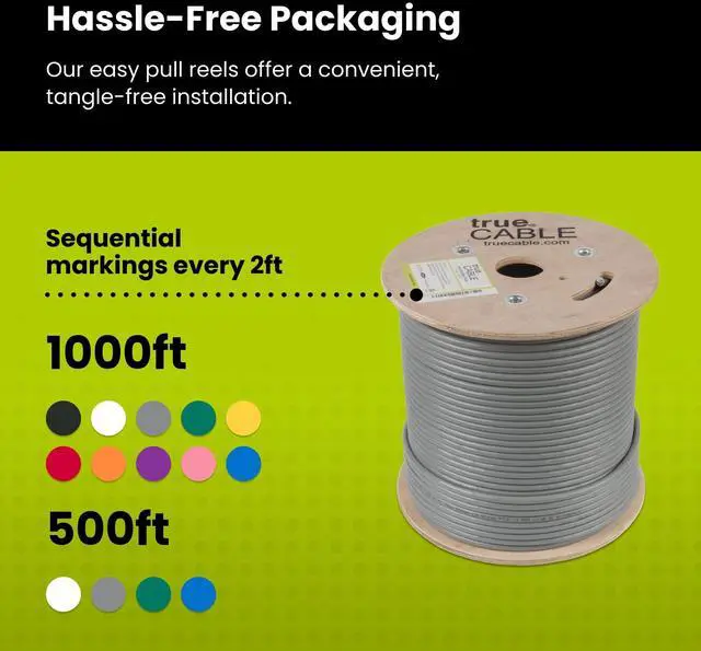Supports Power over Ethernet: PoE/PoE+/PoE++ (IEEE 802.3 af/at/bt) 4PPoE up to 100W. ^^ [Versatile] Riser-rated PVC jacket is perfect for vertical runsbetween floors, in-wall, and non-plenum spaces. A solid choice for offices, home networks, or data centers needing high-speed, reliable Ethernet connections. ^^ [Easy To Use] Comes on a tangle-free, easy-pull reel with sequential 2ft markings on the ethernet cable for accurate measuring. Designed for indoor use to prevent fires from spreading floor to floor in vertical installations with mild flame retardance. ^^ [ Field Tested, Customer Approved] Our data cables have been tested with a Fluke DSX-8000 Versiv CableAnalyzer and comply with ANSI/TIA 568.2 -E standards, RoHS-3 compliant, and cETLus certified. Backed by our outstanding customer support.